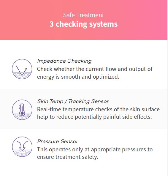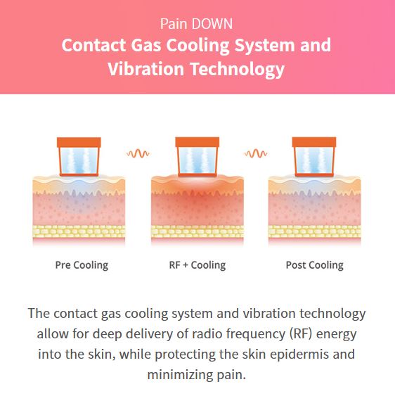 - Technology: Utilizes monopolar RF at a frequency of 6.78 MHz to apply controlled heat to the dermal layer, stimulating collagen production and skin contraction. Incorporates advanced Lift Up Technology with smart safety sensors for skin temperature, pressure, and return pad monitoring. Features a dual-mode system that treats both upper and lower dermis simultaneously, along with integrated vibration and contact gas cooling for enhanced comfort and safety.